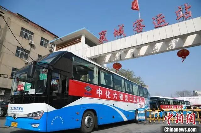 3月12日,湖北省襄阳市,来自中国化学工程第六建设有限公司(简称中化六建)的117名专业技术人员在湖北省襄阳市襄城客运站统一乘坐客车,前往宁夏银川市返岗复工。