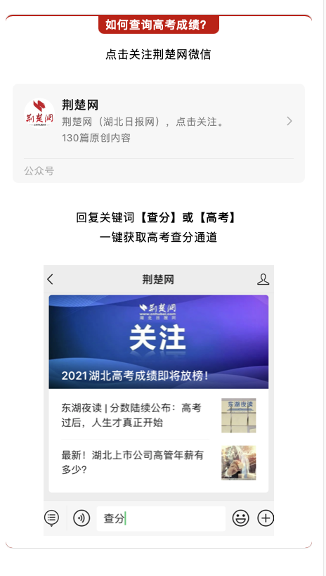 荆楚网(湖北日报网)设置了高考专区。您可以关注荆楚网微信,回复关键词【 高考 】或点击菜单栏,进入查分通道。