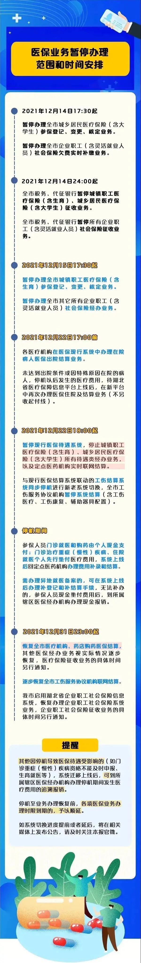 此次切换涉及武汉市1200多万人历年医保数据的整体迁移以及近7800家医药机构的信息系统重建,因此停机时间较长,但医保待遇不受任何影响,居民医保参保缴费期延长至明年2月28日。