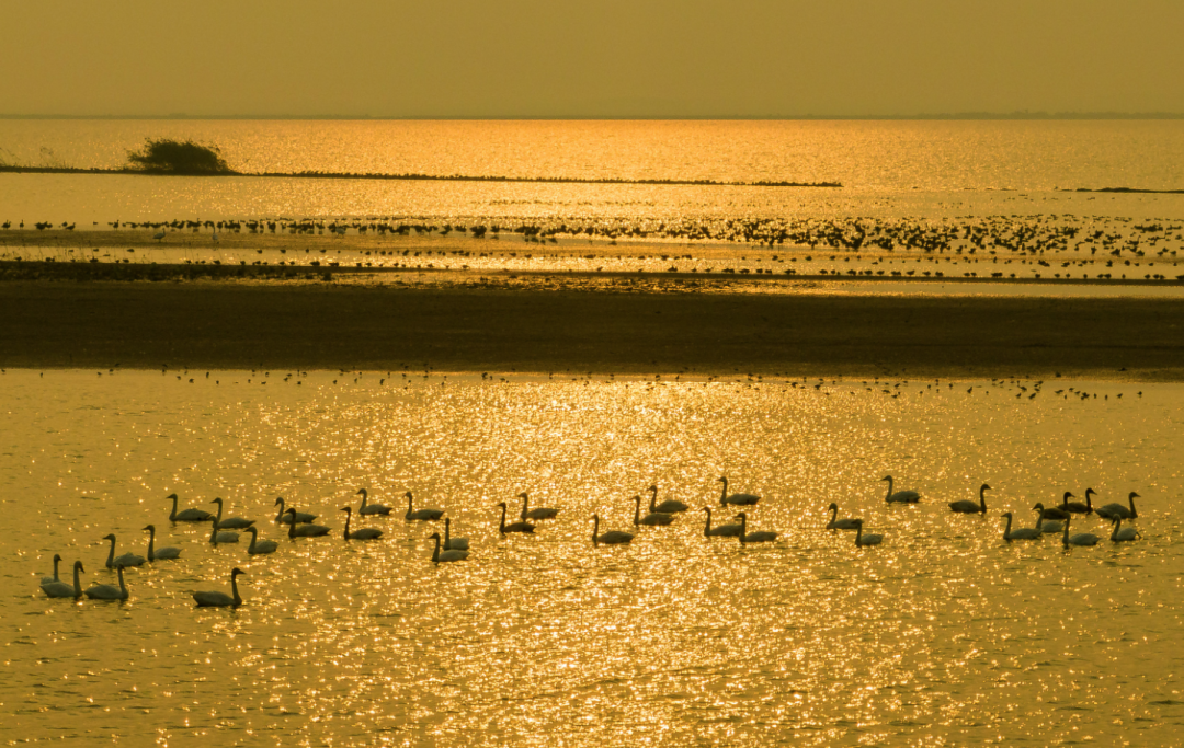 10月31日傍晚,武汉市东西湖区柏泉府河天鹅湖,小天鹅准备越冬。(湖北日报记者 倪娜 通讯员 刘仪聆 晏君 摄)