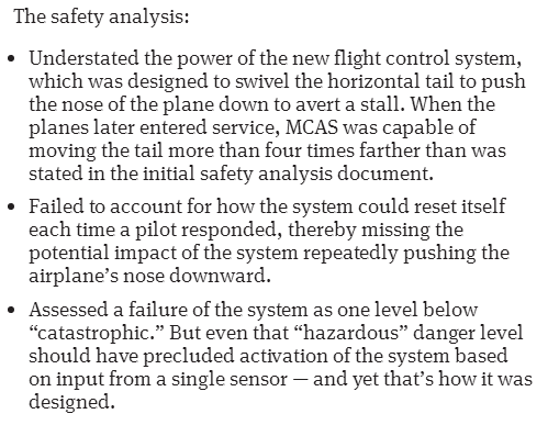 一, 安全报告没有充分标出新型飞行控制系统的全部动力。为了防止飞机空中失速,飞行控制系统可以转动飞机的水平翼,让机头朝下。但客机服役之后,控制系统转动尾翼的速度要比安全评估标出的速度高出三倍多;