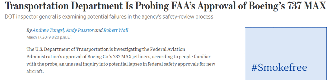 美国《华尔街日报》刚刚消息,据知情人士透露,美国交通部正在对美国联邦航空管理局(FAA)批准波音737 MAX喷气式客机的情况进行调查。《华尔街日报》称,这是一项针对新飞机的安全批准存在潜在失误的“不寻常调查”。美国《西雅图时报》此前援引FAA的工程师的话说,波音737 MAX客机的竞争对手是欧洲空客的A320neo客机,但研发已经晚了九个月,FAA就把波音737 MAX飞行控制系统的安全评估任务交给了波音,并要求自身的工程师们加快检查进度。↓