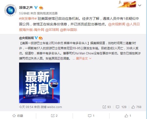外交部领事保护中心:我驻美国使馆已启动应急机制,正在核实遇难者身份信息,并已派员赶赴出事地点。