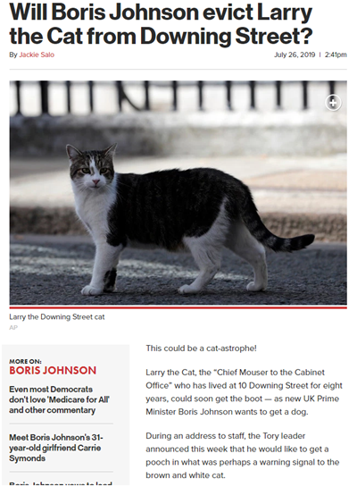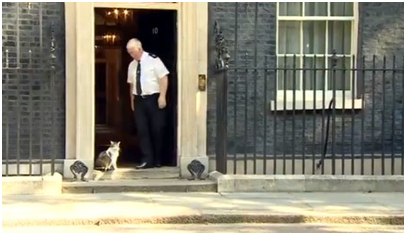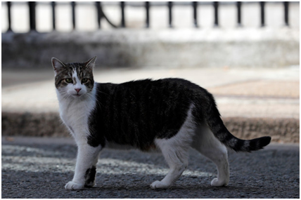刚卸任的英国前首相特雷莎·梅在2016年曾接受过英国《星期日泰晤士报》采访,她表示“非常高兴见到拉里”,但同时暗示了自己其实更喜欢狗。BBC称,她提到首相府有些位置是拉里专属的,但她的办公室并不在其列。今年5月,在特雷莎·梅进行离职演讲之前,原本正在唐宁街10号门口晒太阳的拉里被警察提前抱了回去。