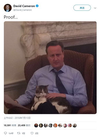 至于拉里的“前前任”——英国前首相卡梅伦,也曾被传说“与拉里不和”,但这一说法被他极力否认。报道称,为了自证“清白”,卡梅伦还曾在推特上传了一张拉里坐在他腿上的照片。
