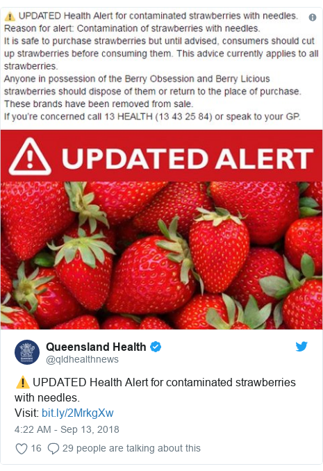 昆士兰州卫生局日前在Twitter上发布声明称,购买草莓仍然是安全的,但建议消费者在食用之前将草莓切碎。昆士兰州政府还声明悬赏10万澳元追查肇事者。(陶稳)