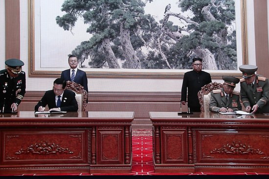 海外网9月19日电 北京时间19日上午,韩国总统文在寅和朝鲜最高领导人金正恩举行会谈并签署《平壤共同宣言》。随后,在金正恩和文在寅的共同见证下,朝鲜人民武力相努光铁与韩国国防部长官宋永武在平壤百花园国宾馆共同签署《关于落实板门店宣言中军事领域共识的协议》(简称“军事协议”)。