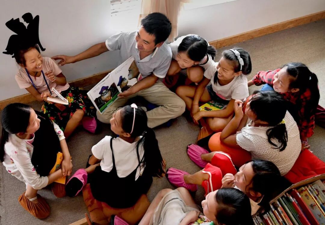 杜明伟在学校书屋内带着学生阅读。