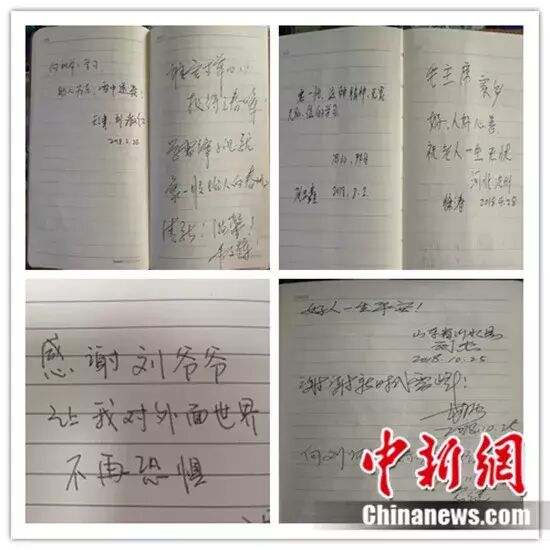 2017 年底,有人帮刘镜辉做了几个留言本,一年多的时间写满了 4 个本子。其中有人写道:感谢刘爷爷让我对外面世界不再恐惧。