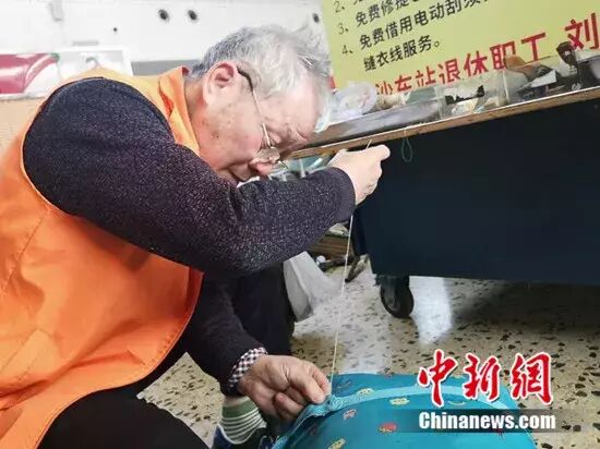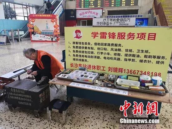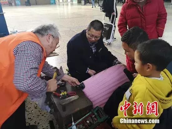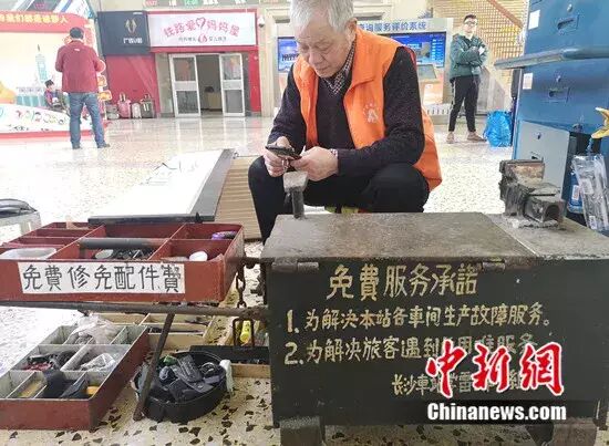 为了便于旅客发现,刘镜辉特意把小推车放在长沙火车站候车大厅显眼的位置,自己便默默地坐在小板凳上,免费为需要帮助的旅客修修补补。这一坐,就是42年。