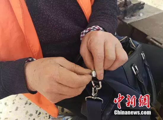 刘镜辉为旅客缝补断掉的手提袋带子。刘曼 摄