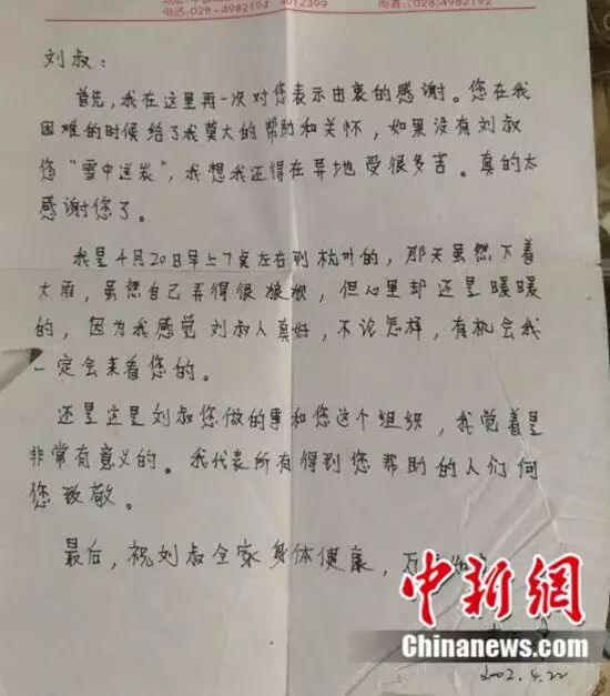后来,这位受助的旅客还寄来感谢信,信中写道:“虽然天下着雨,虽然很狼狈,但因为刘叔的帮助,心里还是暖暖的”。