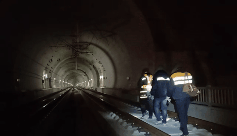道岔设备决定着火车的前进方向。秦岭隧道内气温低、潮气重,信号电子设备对温度、湿度格外敏感。检修中,工人们蹲在铁轨旁,头顶探照灯、对电缆盒进行精细的维护。付子豪说,电缆盒的丝毫破损和裂纹都会影响信号传输的精准性。