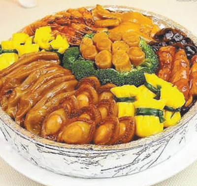 看似简单的一份盆菜,实则荟萃百味,用料包括大虾、蚝仔、鱿鱼、猪皮、冬菇、鸡、鲮鱼球、炆猪肉、萝卜、枝竹及发菜等。烧、焖、烤、炒、卤、炆……各式食材自成一味,再依据特定次序层层叠起,不同滋味互相吸收、浸润,使人越吃越觉鲜美。