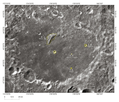 冯·卡门坑内的中央峰则以我国五岳之首的泰山命名,位于嫦娥四号着陆点西北方向约46公里处,其“海拔”高度为-4305米,相对冯·卡门坑面高度约为1565米。泰山是我国首次获得的“山,山脉”类月球地理实体名称的自主命名,这也是自1985年后33年的时间里IAU再一次批准命名“山,山脉”这一类月球地理实体名称。
