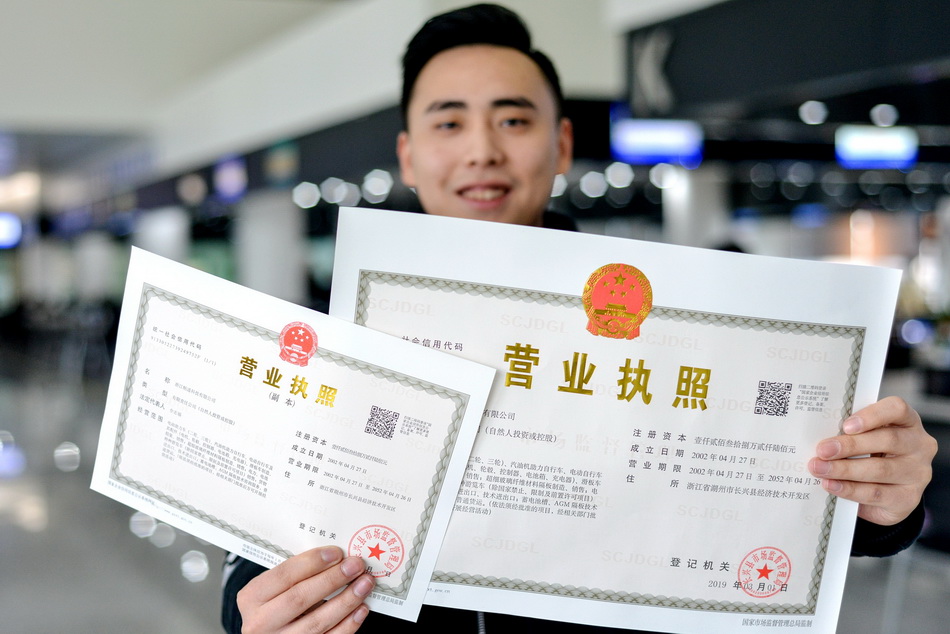 【湖州:市民领取新版营业执照】3月1日,浙江湖州市长兴县政务服务中心,市民正在领取新版营业执照。3月1日起,全国正式启用换发新版营业执照。