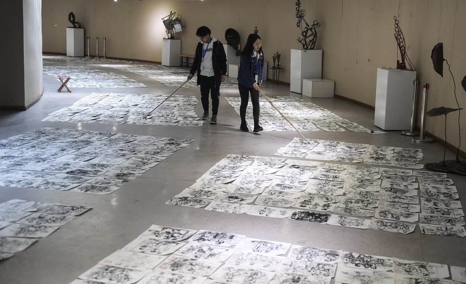 【济南:艺术学院阅卷似“探雷”】2月28日,工作人员手持竹竿排摆考生试卷。当日,山东艺术学院美术校考阅卷工作在长清校区进行,评委们手持竹竿对万余张考生画作评点分档,场面壮观。