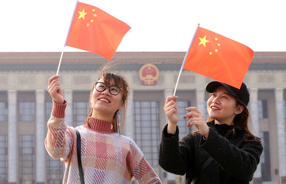 【北京:气温回升,游客喜气洋洋】2月28日,许多游客手持国旗在天安门广场游玩。近期京城处于暖气团的控制下,气温回升明显。本周双休日最高气温可达15℃左右,春天的脚步越来越近了。