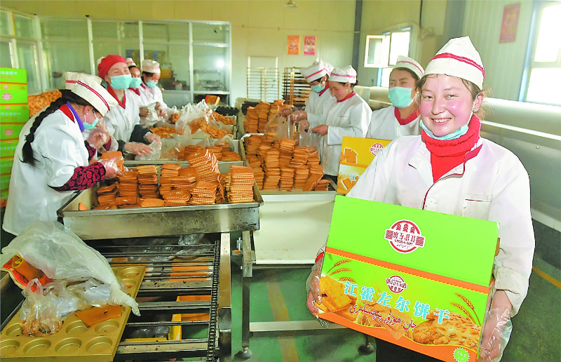 2月11日,阿克苏市阿依库勒镇帕依那甫村村民在村里的食品加工厂生产饼干。该村不少贫困户通过在家门口就业实现了增收。记者邹懿摄