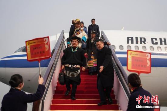3月2日,出席十三届全国人大二次会议的西藏自治区代表团抵达北京。 中新社记者 崔楠 摄