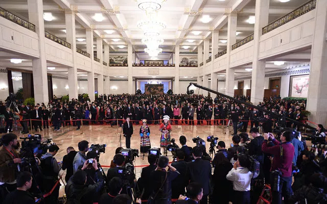 2016年3月16日,第十二届全国人民代表大会第四次会议在北京人民大会堂举行闭幕会。记者在人民大会堂部长通道采访。 (新华社记者王建华摄)