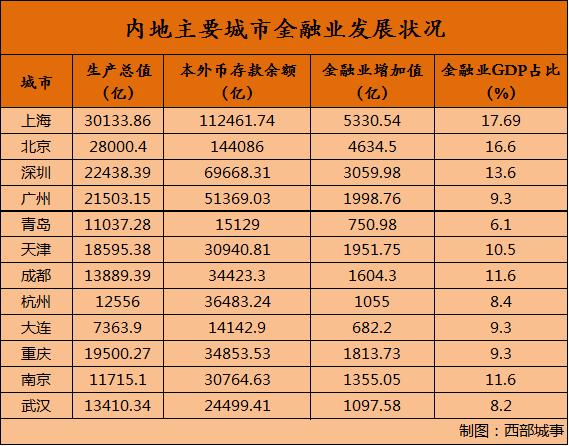 比如重庆,金融业增加值接近广州的水平;南京,本外币存款余额是大连的两倍。