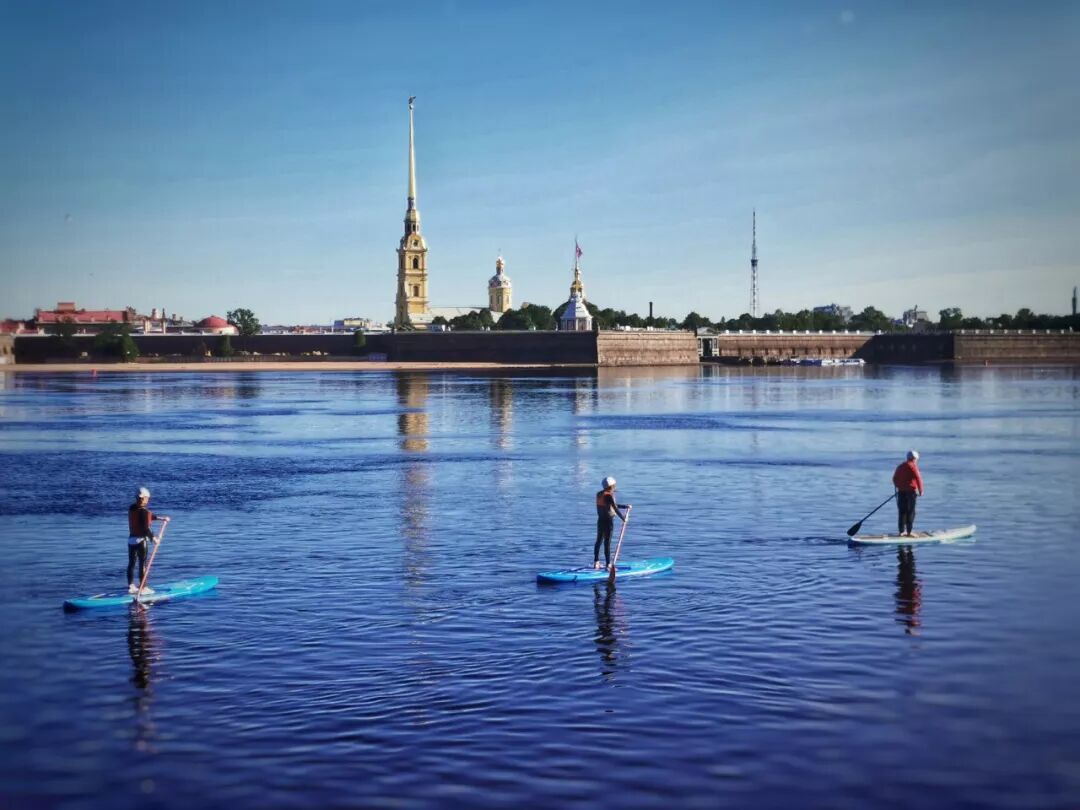 清晨,圣彼得堡市涅瓦河上,人们在水上运动。新华社记者王晔摄