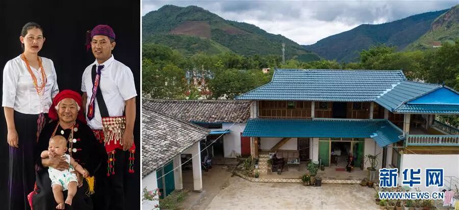 左图:普洱市西盟佤族自治县新厂镇永广村一组佤族村民呢秒(前排右)一家合影(6月15日新华社记者胡超摄);右图:呢秒家的新房2017年建好,旁边的老房子现在用作厨房。呢秒一家种植青贮玉米5亩,套种皇竹草20亩,主要用于企业养牛的饲料,年收入约10万元(6月15日新华社记者秦晴摄)。