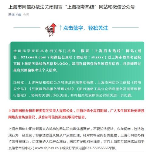 上海市网信办和市教委有关负责人提醒公众,目前正值中高招期间,广大考生和家长要增强网络安全防范意识,从合法可信的渠道获取招考信息。