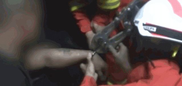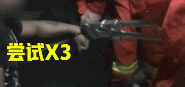 为了不让该男子的手腕受到伤害,一名消防员负责把该男子的手固定住,并用手把手铐的空隙处抵住,再由另一名消防员拿着绝缘剪对手铐薄弱处进行剪切。