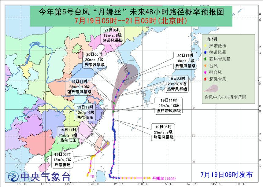 受其影响,7月19日08时至20日08时,7月19日08时至20日08时,巴士海峡、台湾海峡北部、台湾岛以东洋面、南海东北部海域、东海大部海域、黄海东南部海域以及钓鱼岛附近海域,长江口区、台湾岛西北部和南部沿海、浙江北部沿海将有6-7级大风,阵风可达8-9级;其中东海东北部和南部海域、黄海东南部海域有8-9级,“丹娜丝”中心经过的附近海域的风力有10级,阵风可达12-13级。台湾岛大部将有中到大雨,台湾岛中南部局地有暴雨到大暴雨(100-200毫米)。中央气象台7月19日06时继续发布台风蓝色预警(见图1)。