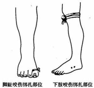 三、立即用带子(也可在衣服上撕下来布条)在伤口上方(距伤口2-3寸的地方)绑住,用来阻止血流将毒液带到心脏。