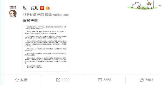 今日午时,陈一发在个人微博@陈一发儿 发表道歉声明称,不应该拿历史事件开玩笑,本人也非常后悔和自责。同时,她2010-2011年在微博上的一些愤世嫉俗观点也是很错误的,一定会从中深刻吸取教训,在今后的日子里,会加倍注意自己的言行,不会再犯类似错误。自己也会持续参加公益活动,用自己的影响力尽力挽回造成的不良后果。请大家时刻监督。