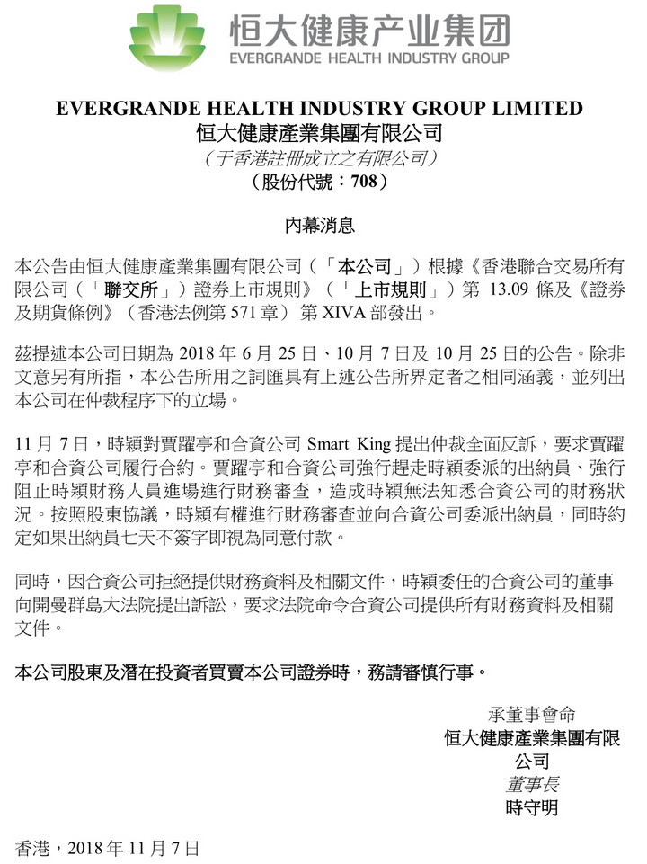 今年10月7日,恒大的一纸公告让公众看到两家已经翻脸。公告中表示,Smart King Ltd.于10月3日向香港国际仲裁中心提出仲裁,要求剥夺恒大旗下时颖公司作为股东享有的融资同意权,并解除所有协议。