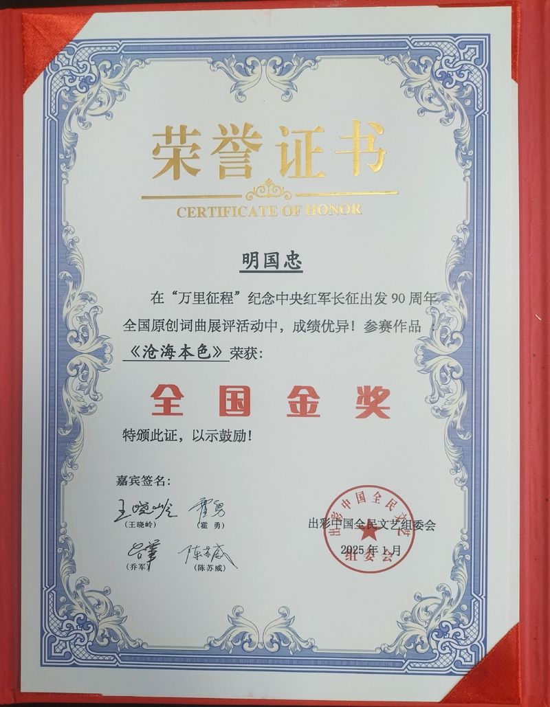 《沧海本色》是明国忠去年6月份创作的,12月份送京参评。由于歌词文笔优美,贴近时代脉搏,弘扬社会正能量,获得评委们的一致好评,该作品在今年元月的评审会上脱颖而出,获得“全国金奖”,这也是此次歌词评选的最高奖项。