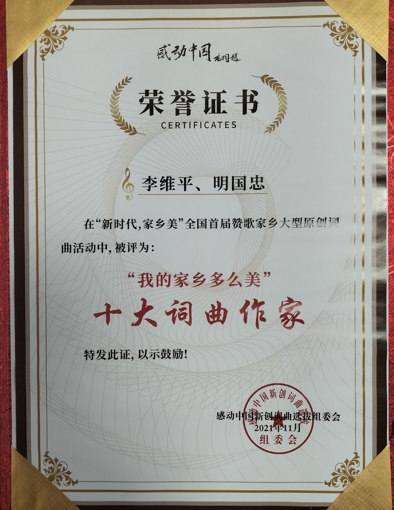 令明国忠没想到的是,这首《高溪水》一举成名,在2021年“感动中国——我的家乡多么美”原创词曲评选活动中,获得“十大词作家”的美誉。《高溪水》由知名曲作家李维平作曲,如今已在社会上流传开来。