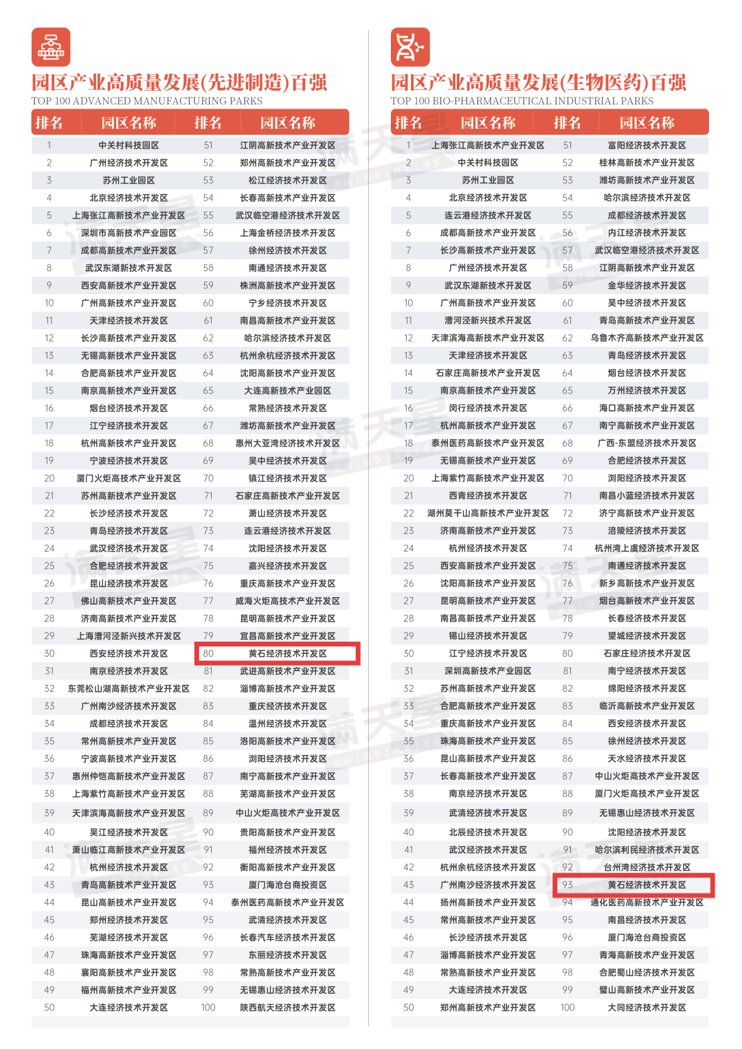 报告显示,黄石经济技术开发区位列全国第81位,较上一年上升4位,实现了四年四进位;再次入选“先进制造业”百强园区,排名第80位,较上一年上升3位,实现了两年两进位。同时,该区还首次入选“生物医药”百强园区,排名第93位。