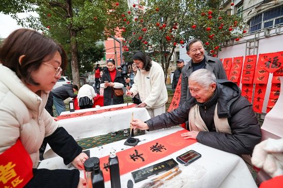 当天,这里办起了“百家团圆宴”活动。灯笼高挂,小区广场上75张圆桌整齐排开。在全家福拍摄点,73岁的王大爷在儿女陪同下拍下合影。他说:“孩子们今天回来陪我们,准备一起在社区提前吃幸福团圆饭。”三名书法老师现场书写春联,墨香弥漫。一旁悬挂的许愿纸条寄托了居民对亲友的祝福。