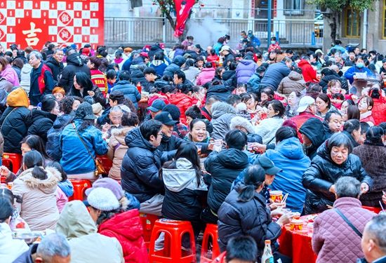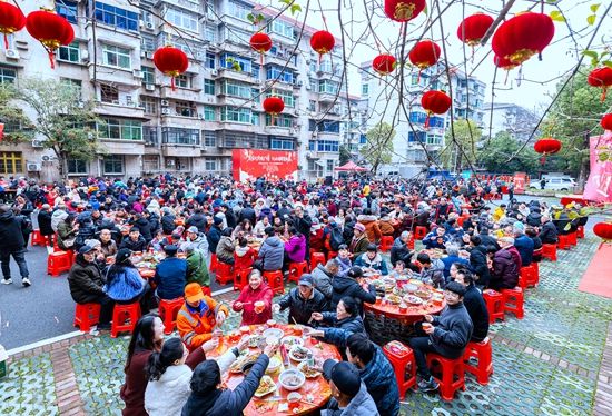 “这第一杯,敬祖国国泰民安!”小区业委会主任孙德于宣布青龙山社区电厂小区“百家团圆宴”正式开席,举起杯中饮料倡议,众人齐声应和。大家边吃边聊,邻里情谊愈发深厚。