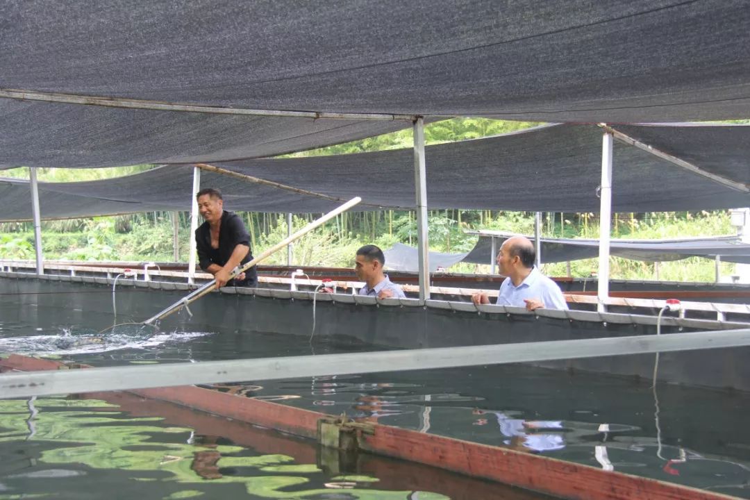 在村里的动员下,2016年底潘小兵回到了家乡,投资1000万元建起了中华鲟养殖基地。利用山泉水地势落差,沿着河边建起6个大大小小的池子,试养了3万尾中华鲟鱼。“目前中华鲟的市场价格是每斤50元左右,”田浩怡说,每条鱼可以卖到100块钱左右,第一批试养的现在可以卖80万元,村里每年还有3万块钱土地流转收入,不仅如此还带动了周边村民务工,不少村民也愿意一起养殖。