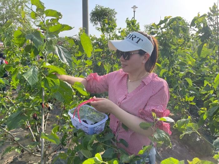 采摘节现场,等待入园的游客排成长龙,边上停车场停满车辆。200亩的采摘园内,一串串红彤彤、紫盈盈的桑果压满枝头,晶莹剔透。游客提上小篮,三五成群,欢声笑语,体验着“边走边摘、边拍边尝”的乐趣。“味道真棒,似乎又回到小时候在桑树地里钻来钻去的日子。”桑园里不时传来游人爽朗的欢笑。