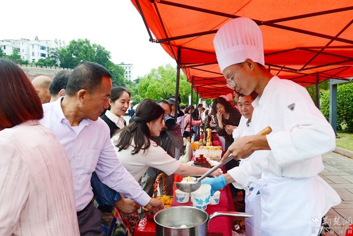 在东坡肉、手工鱼丸展台前,热气腾腾的烟火气里,是排着长队的观众,大家端着小碗,兴趣盎然地等着品尝和购买,成了今天活动的一道亮丽的风景线。