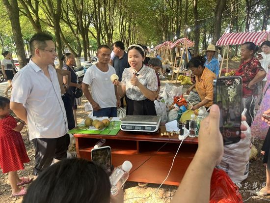 当天下午,黄梅县五祖镇携手该县商务局创新服务模式,充分发挥电商直播在联农助农、吸引促销方面的独特优势,组织“乡野八妹”“胡子哥”“费贇”等本土网红直播团队,走进五祖镇开展助农直播带货活动,帮助果农拓宽销售渠道,将当地雪梨、板栗等特色农产品推向市场。