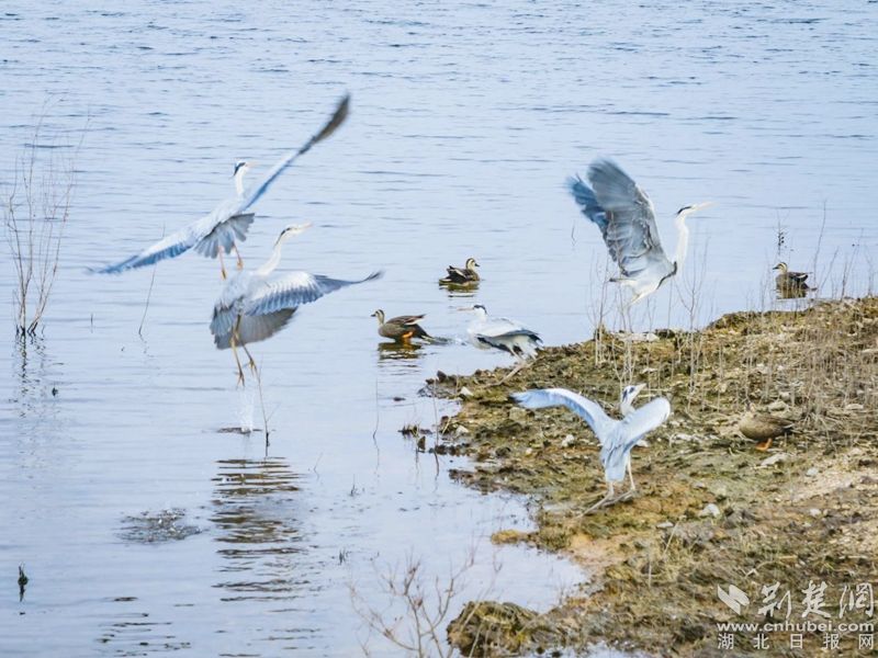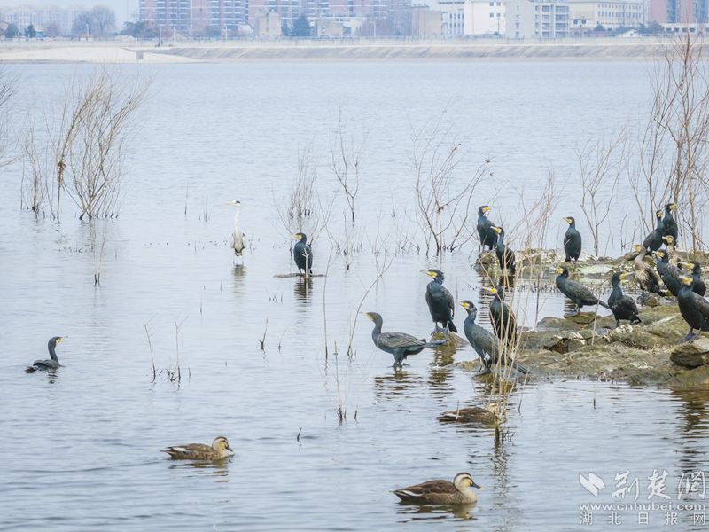 2月10日,在湖北省红安县金沙湖国家湿地公园,一群鸬鹚、苍鹭和绿头鸭在湖面上自由游弋,迎接春天的到来。
