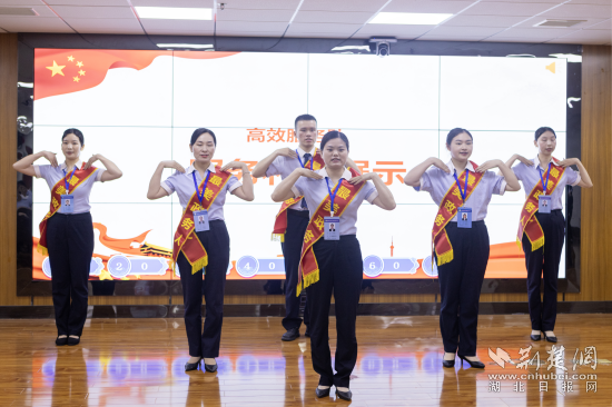 礼仪展示显风范。在礼仪展示环节,各队队员身着统一工装惊艳亮相,行云流水一般展示“服务礼仪七步曲”、仪容仪表自检操,展现了政务服务工作者“规范不失亲和,专业更显温度”的职业形象。