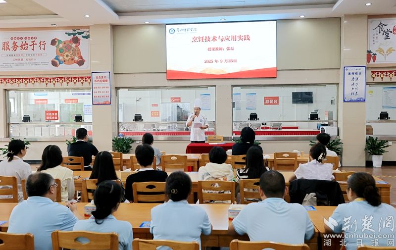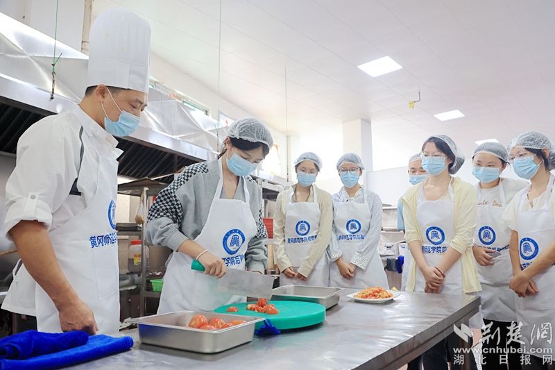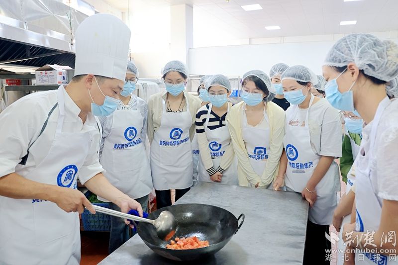 荆楚网(湖北日报网)讯(记者 陶辉 通讯员 王东 罗益波) “原来番茄炒蛋要这样炒才更有色相!”9月25日,黄冈师范学院教工食堂的后厨里,飘散着诱人的饭菜香气。平日里为学生打菜的食堂大厨们,此刻有了新身份——烹饪课老师,正手把手地指导学生翻炒、调味。