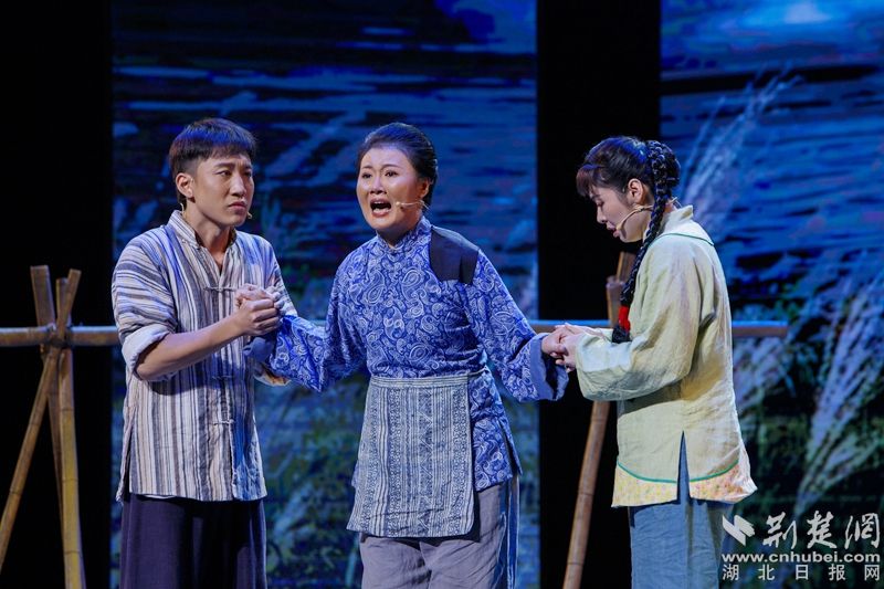 终评舞台上,剧组的心血得到了完美呈现。剧目以渡江战役宏大历史为背景,聚焦团风江边一户普通人家在战火中的婚礼抉择,将“小家婚礼”与“大国大义”紧密相连。演员们用富有张力的表演,将角色内心的挣扎、坚定与奉献刻画得淋漓尽致;简约而富有质感的舞台设计,成功营造出历史现场的沉浸感。当剧中新郎水生毅然告别新娘、回眸奔赴前线的那一刻,家国情怀与儿女情长的交织,达到了震撼人心的艺术效果,现场许多观众不禁潸然泪下。