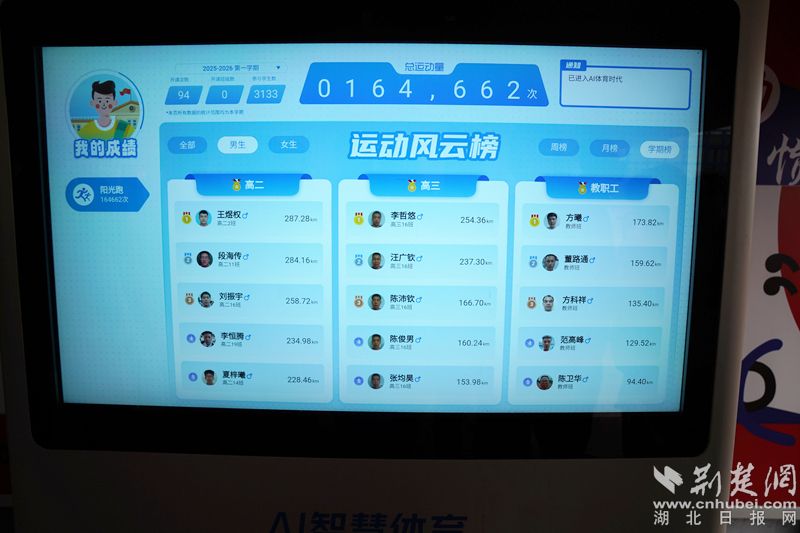 荆楚网(湖北日报网)讯(记者陶辉 通讯员付海洋 汪秀兵)冬日暖阳下,黄冈中学田径场边的智慧大屏,实时滚动着师生的跑步排名、速度和里程。人脸识别系统自动记录数据,为每个人生成动态的“健康档案”。