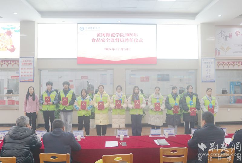 荆楚网(湖北日报网)讯(通讯员 王东 罗益波)12月24日下午,黄冈师范学院一场温馨而庄重的聘任仪式如期举行,15名来自教师和学生群体的代表,从校领导和市场监管部门负责人手中接过红彤彤的聘书,正式成为2026年度校园“食品安全监督员”。