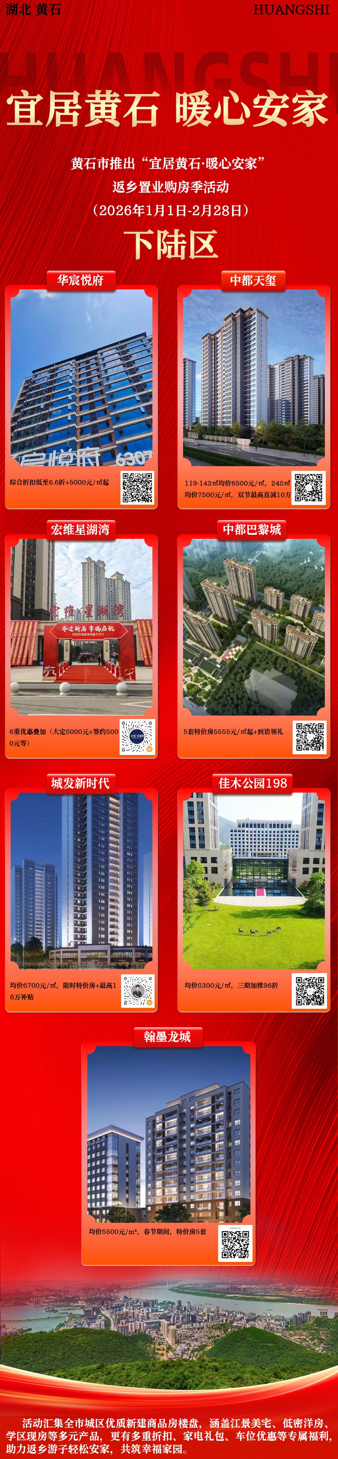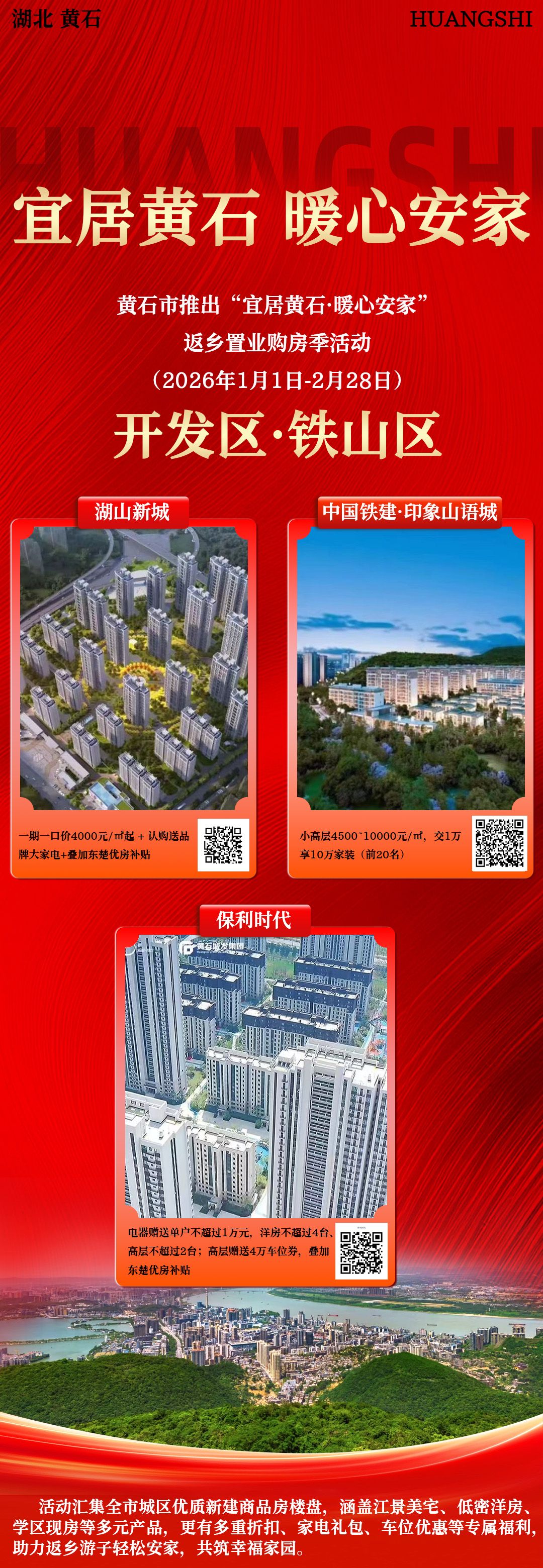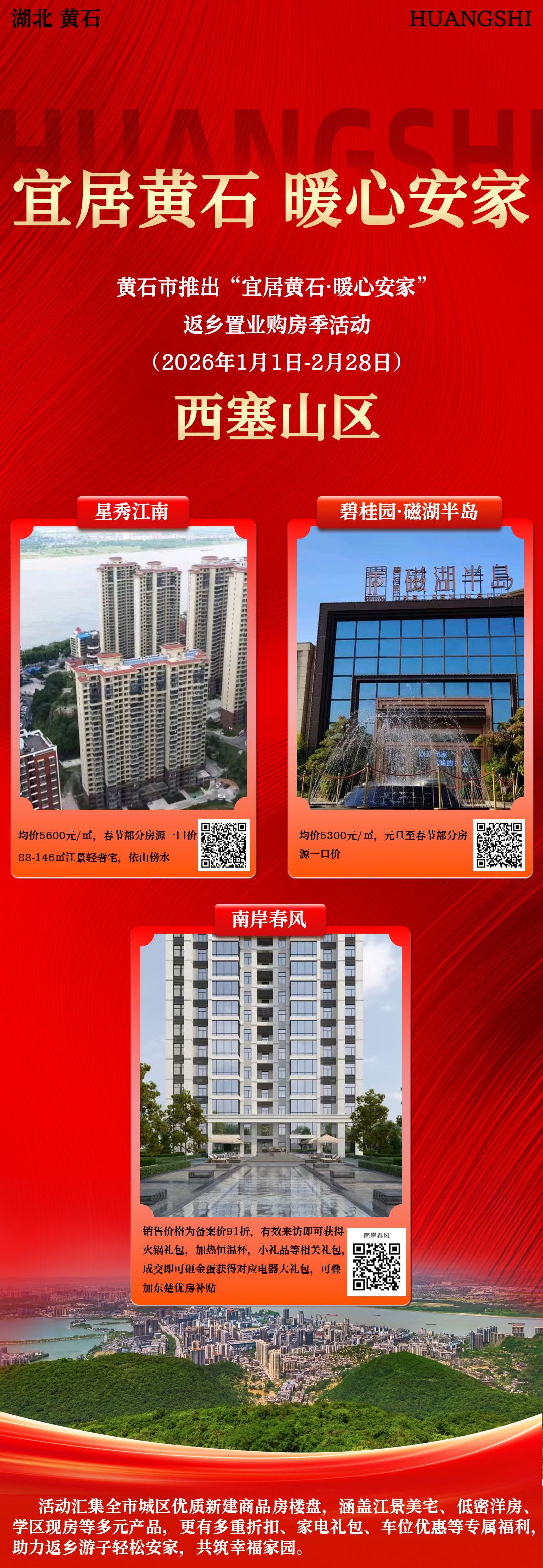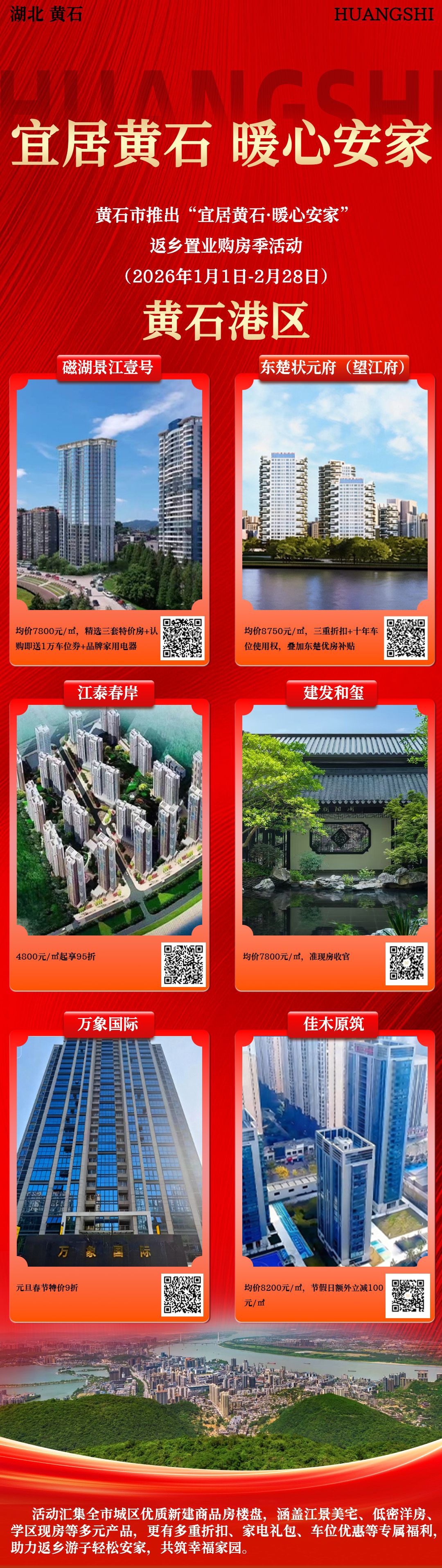 荆楚网(湖北日报网)讯(记者 阮琼 通讯员 何新民)1月15日,记者从黄石市住新局获悉,值此岁末年初之际,黄石市特推出“宜居黄石·暖心安家”返乡置业购房季活动。活动自2026年1月1日起,一直持续到2月28日,联动城区19个优质楼盘推出多重折扣、家电礼包、车位优惠等专属福利。